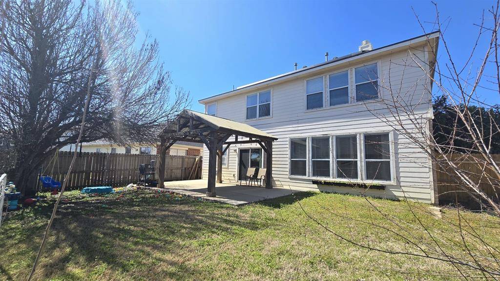 The interior layout places all bedrooms on the second floor, along with a dedicated game room. The first floor includes the main living areas, consisting of the kitchen, living room, dining area, laundry room, and a half bath. The backyard includes a pergola structure, offering covered outdoor space.