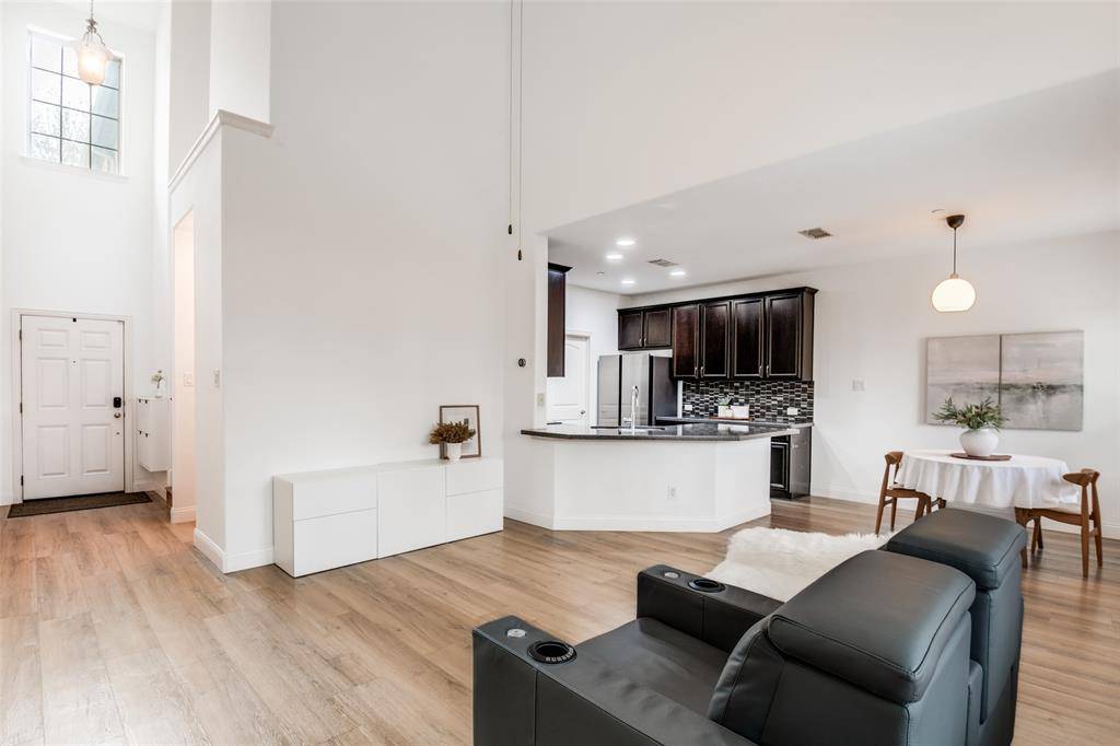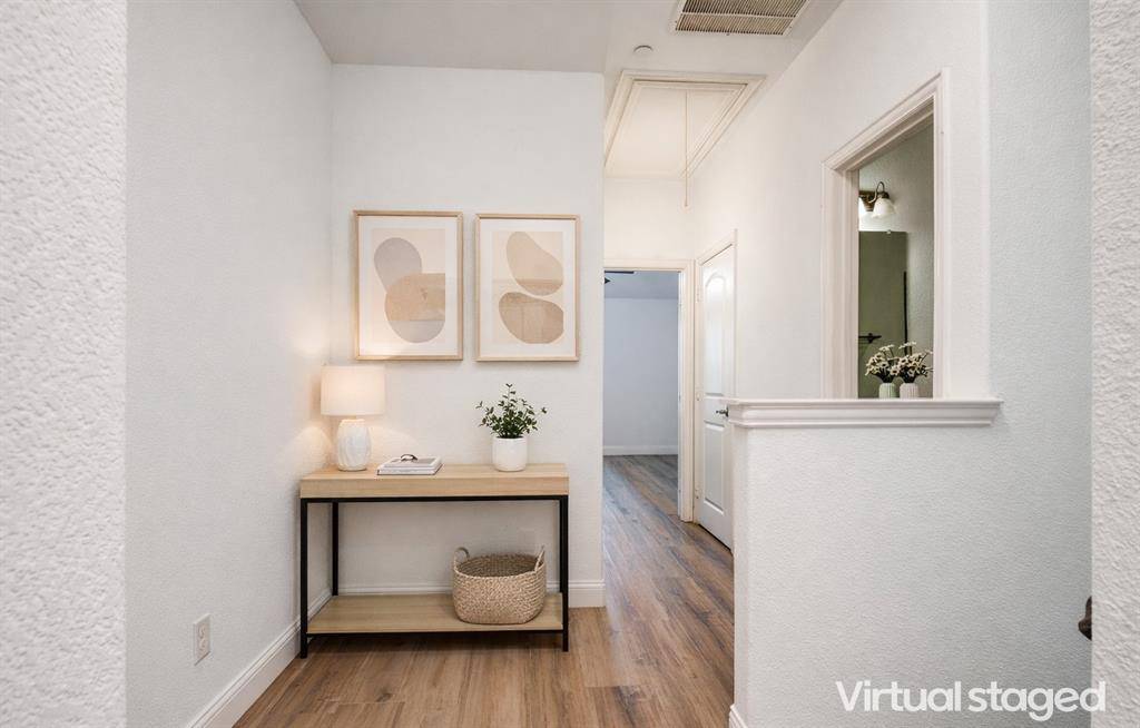 Beautifully renovated and spacious townhome featuring soaring ceilings and abundant natural light. The open floor plan showcases gleaming wood floors throughout — no carpet anywhere, one of the home's standout features, offering a clean, modern look and easy maintenance.