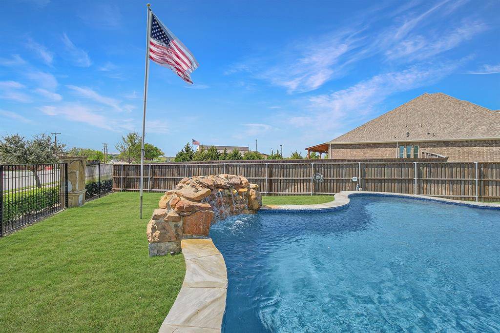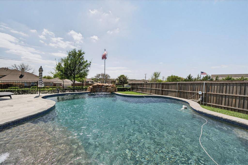 This resort-style escape features travertine decking, a beautiful waterfall, and a covered patio with ceiling fans and ambient lighting—perfect for entertaining or unwinding.