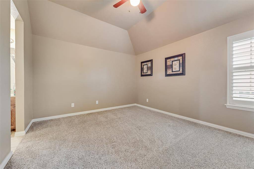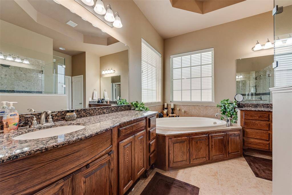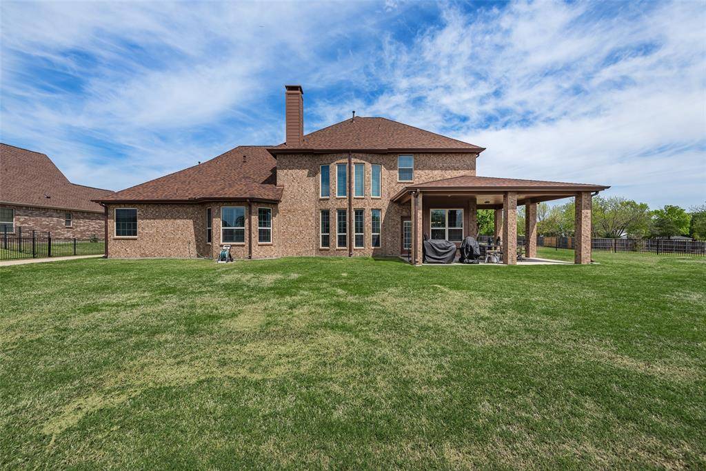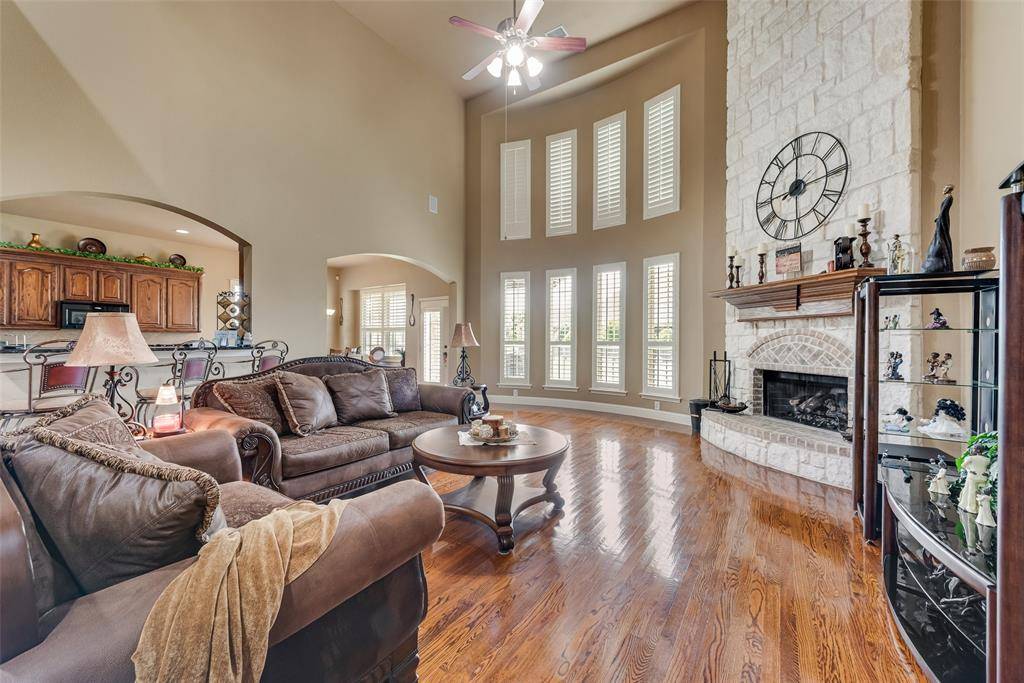 Stunning executive home situated on an oversized corner lot in one of Wylie's most desirable neighborhoods! This spacious residence offers exceptional functionality and premium upgrades throughout, featuring a 3 car attached garage plus a detached 4th garage, perfect for extra vehicles, workshop space, or additional storage. Step inside to find rich wood flooring throughout the main living areas and a dramatic floor-to-ceiling stone fireplace that anchors the living room with warmth and elegance. The thoughtfully designed downstairs layout includes a private primary suite along with a second bedroom and full bath, ideal for guests, in-laws, or a dedicated home office. Designed for both entertaining and everyday comfort, the home boasts an extended wraparound covered back patio, ideal for outdoor gatherings and year-round enjoyment. Upstairs, you'll find three additional bedrooms, two full bathrooms, a generously sized game room, and a dedicated media room with 7.1 surround sound, creating the perfect setup for family living and entertaining. Major system upgrades provide peace of mind, including a Class III impact-resistant roof installed in August 2025, three centralized HVAC systems, two water heaters, whole-house water softener, whole-house surge protector, and insulated garage doors. Elegant custom shutters add timeless style and privacy throughout the home. This rare property combines space, luxury, and practical upgrades, all on a premium oversized corner homesite in the heart of Wylie.